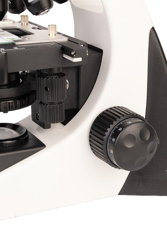- Platina mecânica com área de 125 mm x 115 mm, com escala vernier de 0,1mm, movimentos “X” e “Y” feitos por botões conjugados á direita;