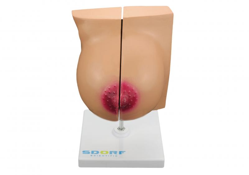 Modelo anatômico de glândula mamária em repouso em tamanho natural, confeccionado em PVC com pintura feita à mão e cores realísticas;
