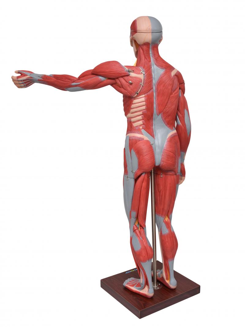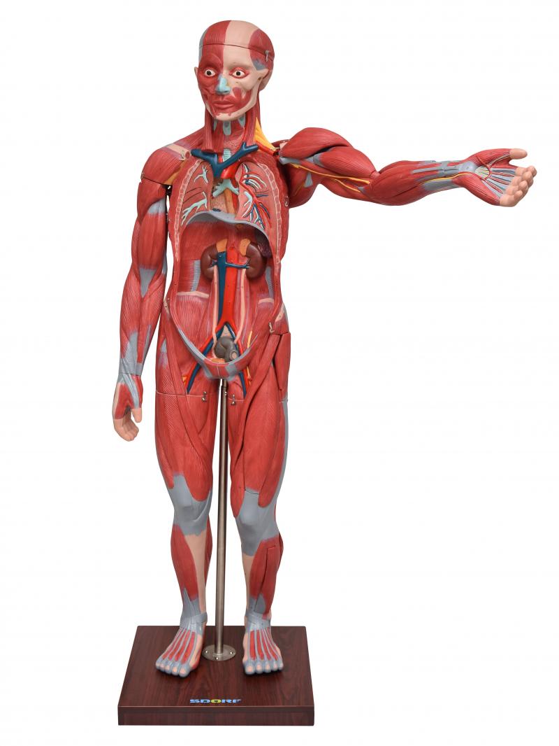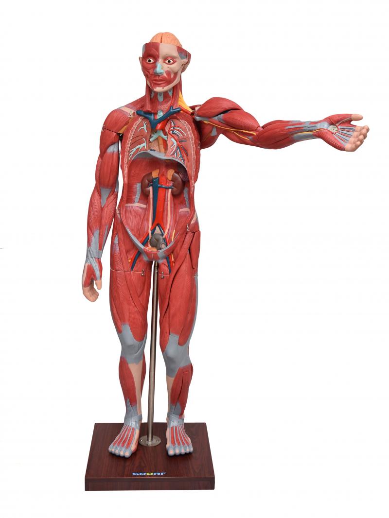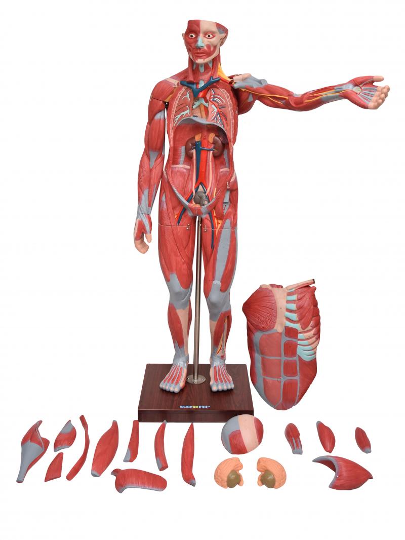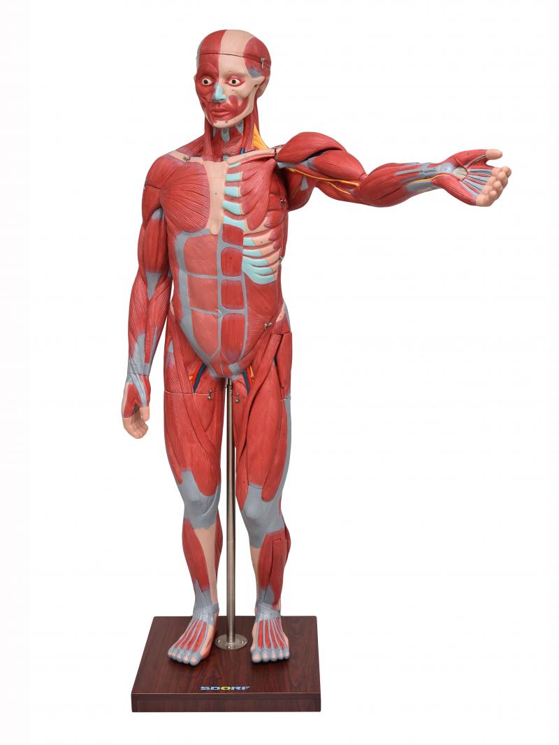 Com o modelo anatômico de figura muscular de 1,70 SD-5026/B, é possível estudar de forma detalha a musculatura superficial, a musculatura profunda, vasos e nervos; esta figura muscular possui 198 pontos identificados, que facilitam a identificação de cada estrutura, e podemos visualizar dentre outras:
