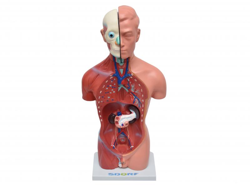 Como o modelo anatômico de torso humano masculino de 42 cm de altura e com 13 partes SD-5023 é possível identificar dentre outras estruturas: Ossos / Músculos / Glândulas / Nervos / Órgãos / ligamentos / Tecidos.